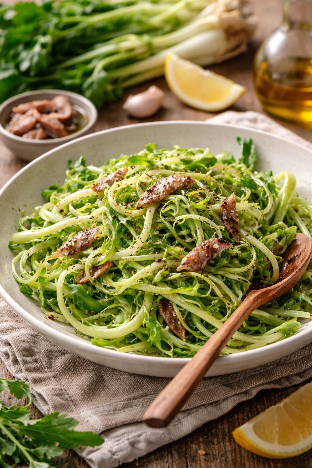 La puntarelle n’est pas un légume “facile”. Elle demande un peu d’attention, un peu de technique.